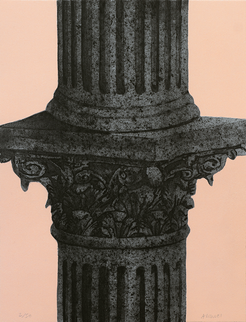 En esta pieza de An Wei, el capitel corintio se erige como un fragmento arrancado al tiempo, un vestigio que aflora desde ese ápeiron (ἄπειρον) entendido como principio primero, ilimitado, del que brota toda forma antes de ser nombrada. Sobre el fondo rosa, la columna parece surgir precisamente de ese origen indefinido, como si la imagen emergiera desde un territorio primordial donde lo clásico aún no está fijado y la memoria, todavía dispersa, empieza a configurarse. An Wei transforma esa referencia arquitectónica en un dispositivo íntimo: un pilar que sostiene no tanto un edificio como una urdimbre emocional.